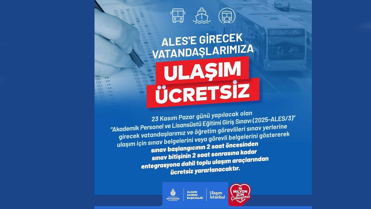 23 Kasım Pazar günü yapılacak olan “Akademik Personel ve Lisansüstü Eğitimi Giriş Sınavı'na (ALES)” girecek vatandaşlarımız ve öğretim görevlileri, sınav belgelerini göstererek, sınav başlangıcından 2 saat önce ve sınav bitişinin 2 saat sonrasına kadar İBB'ye bağlı toplu ulaşım araçlarından ücretsiz yararlanabileceklerdir.