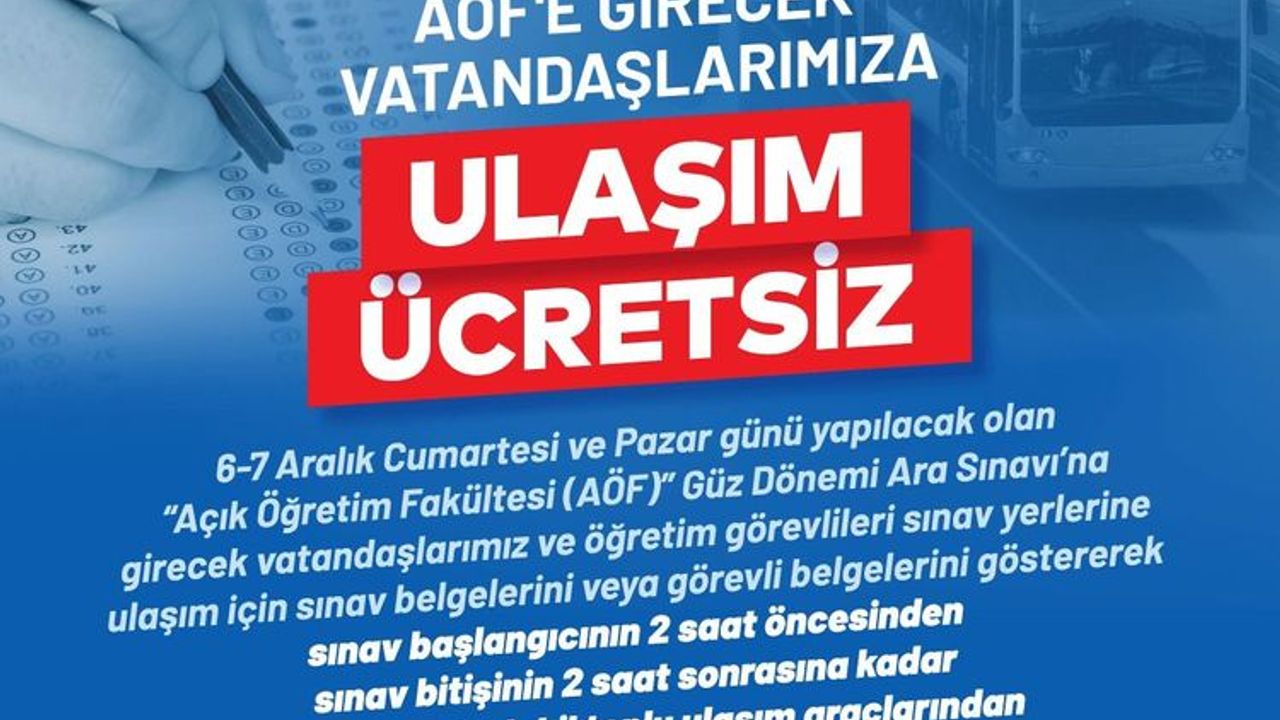 6-7 Aralık Cumartesi ve Pazar günleri “Açık Öğretim Fakültesi (AÖF)” ara sınavlarına girecek olan vatandaşlarımız ve öğretim görevlileri, entegrasyona dahil toplu ulaşım araçlarından ücretsiz yararlanabilecek. Kamuoyuna duyurulur.